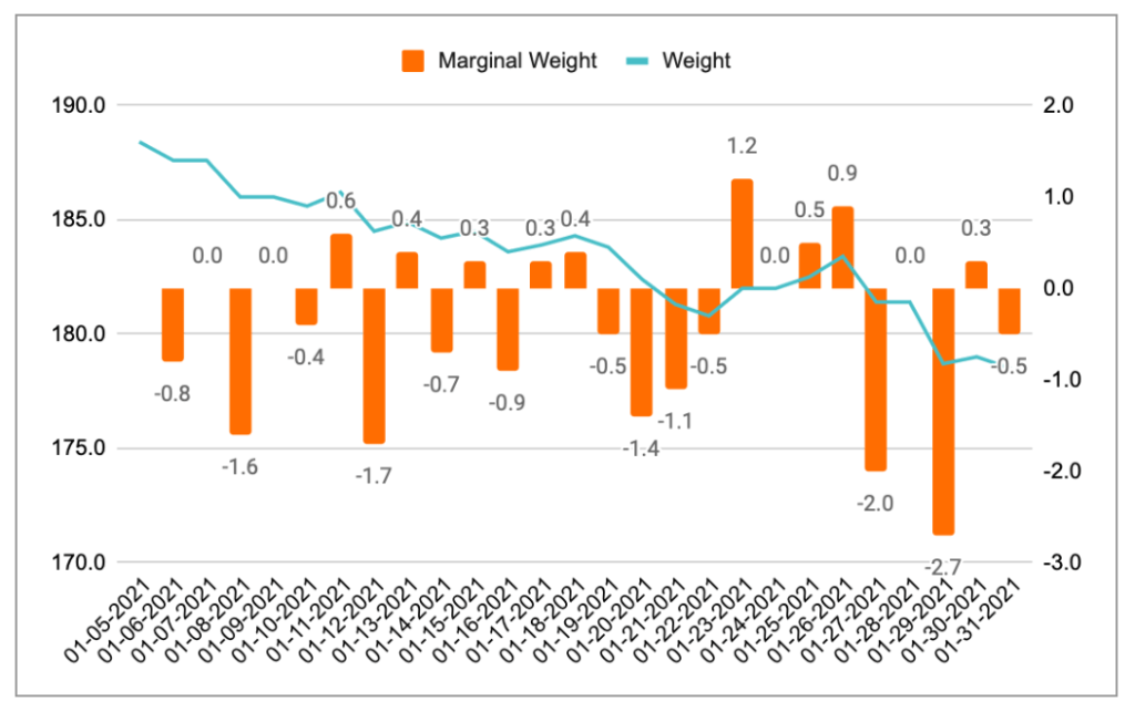 For most of these metrics I plotted the total metric against the marginal change, meaning if my weight decreased between two days, the marginal value would be negative. Conversely, if I was gaining weight it would be positive. Think of it as the difference between a given day and the prior day. The results were astonishing: