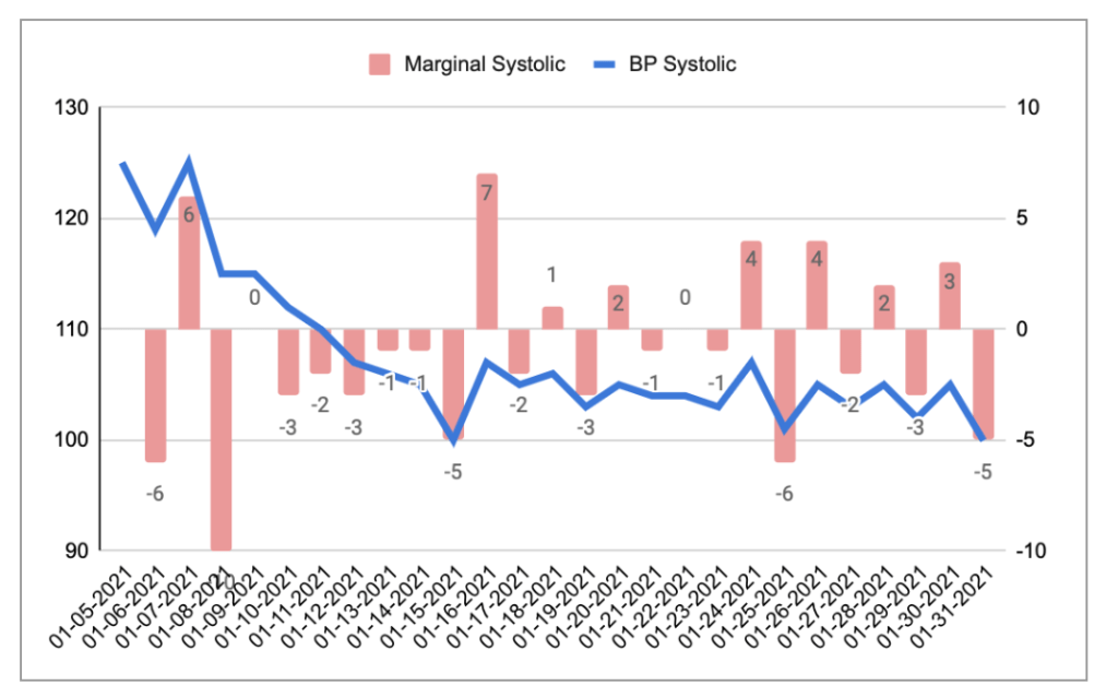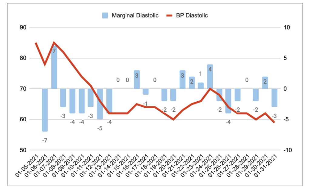 Unsurprisingly, a vegan diet improved both measures of blood pressure. What was especially a surprise, however, was the speed. All of the improvement occurred in the first 10 days of starting the diet, and plateaued thereafter. Essentially there was little change post 1/18 or so (FYI I started this challenge on 1/05 so a bit of a delay compared to the calendar month). Theres a bit of tail off at the end which I think was related to weight loss described above.