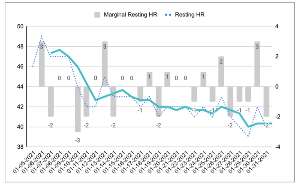 Also unsurprising given the BP numbers, my heart rate fell consistently throughout the 30 days: