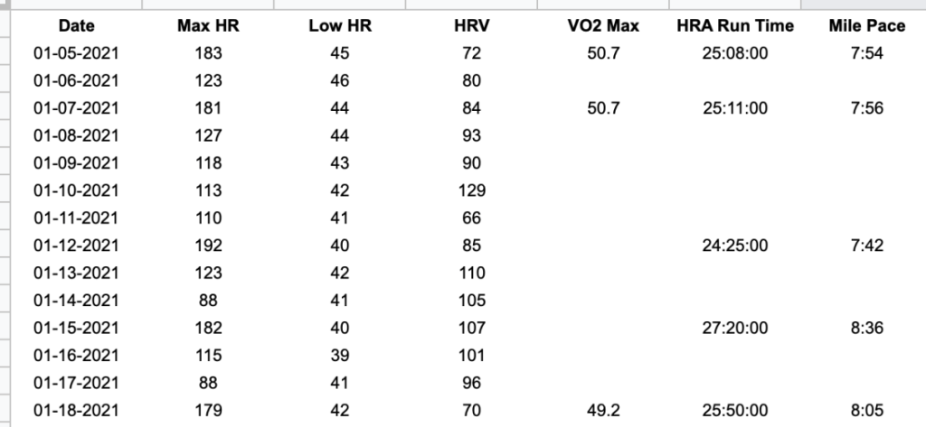 – Cardio/Endurance/Energy Levels: While these were stable the first ~7 days, I had issues with stamina starting in week 2 that impacted my ability to run fast. While I do not have as clean of data in graph form for these measures, my average mile time (running 5k consistently) and HRV (heart rate variability) became materially worse. Interestingly enough my maximum heart rate to sustain a controlled mile time was higher in weeks 2 & 3. Some of that data here: